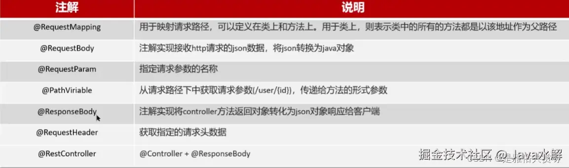 @PathViriable:从请求路径下中获取请求参数(/user/{id}),传递给方法的 形式参数;@ResponseBody:注解实现将controller方法返回对象转化为json 对象响应给客户端。@RequestHeader:获取指定的请求头数据。
