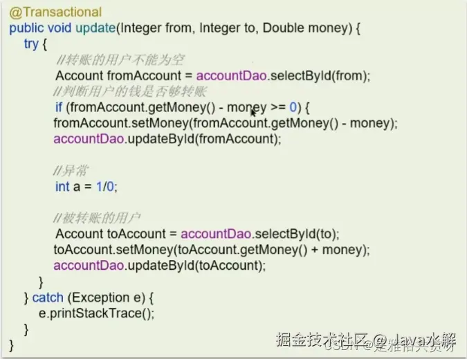 第一个,如果方法上异常捕获处理,自己处理了异常,没有抛出,就会导致 事务失效,所以一般处理了异常以后,别忘了跑出去就行了。