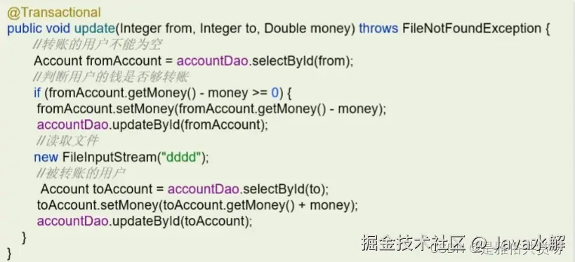 有如下代码,读取的文件不存在,会抛检查异常,导致事务失效。