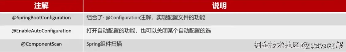 答:Spring Boot的核心注解是@SpringBootApplication , 他由几个注解组成 : @SpringBootConfiguration: 组合了- @Configuration注解,实现配置文件的功能; @EnableAutoConfiguration:打开自动配置的功能,也可以关闭某个自动配置的选项 @ComponentScan:Spring组件扫描。