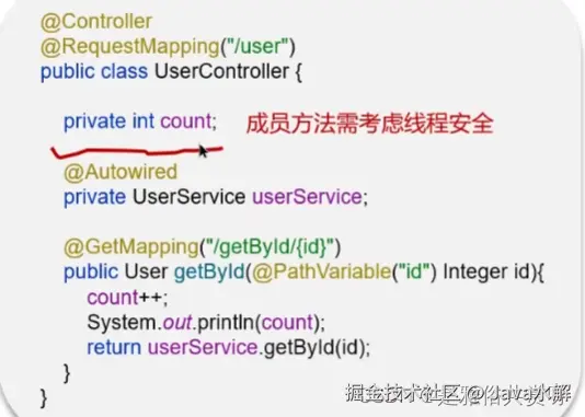 假如同时有多个请求过来,那么每个请求都会修改count这个变量,因为count是成员变量,那么就不是线程安全的了。 如果是局部变量一般情况下没有[线程安全问题]。而userService虽然也是成员变量,但是因为它是五状态的类,所以没有线程安全问题。