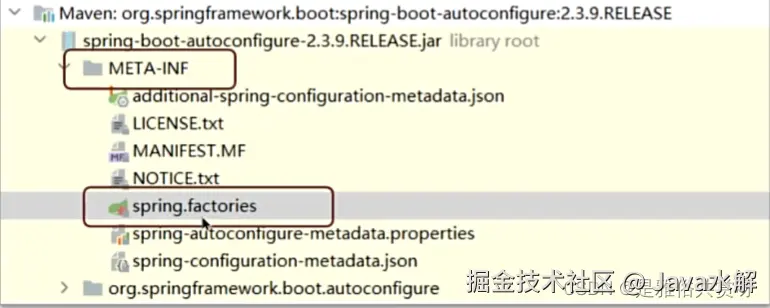 这里面他会加载一些文件,最重要的是META INF/spring.factories文件中的所配置的类的全类名。点击这个spring.factories配置文件进去会发现很多都是以autoconfiguation结尾的自动配置类,有缓存的,有aop 的,有RabbitMQ的等。