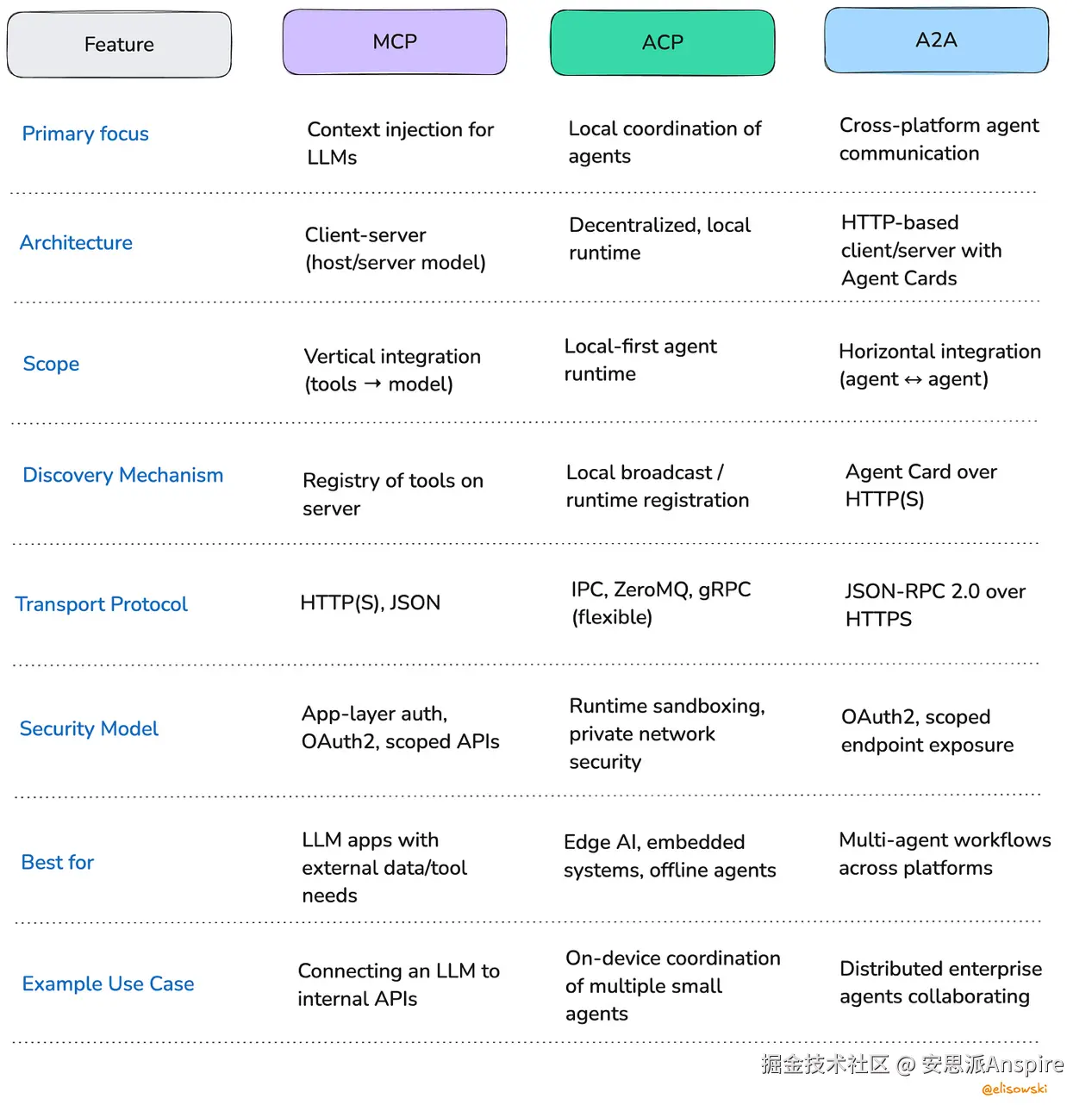 与ACP的本地优先定位或MCP的工具集成层不同,A2A解决的是横向互操作性问题——它标准化了不同厂商或运行时的智能体如何在开放网络上交换能力并协调工作流。