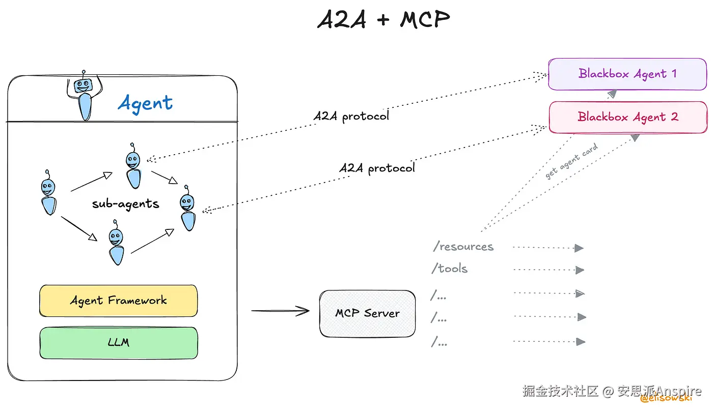 而A2A则构建于上层,专注于智能体间的协作。它为智能体提供了共同的通信语言和规则,使其能够发现彼此、委派任务并协商协作方式——即便这些智能体由不同厂商开发或在不同平台上运行。