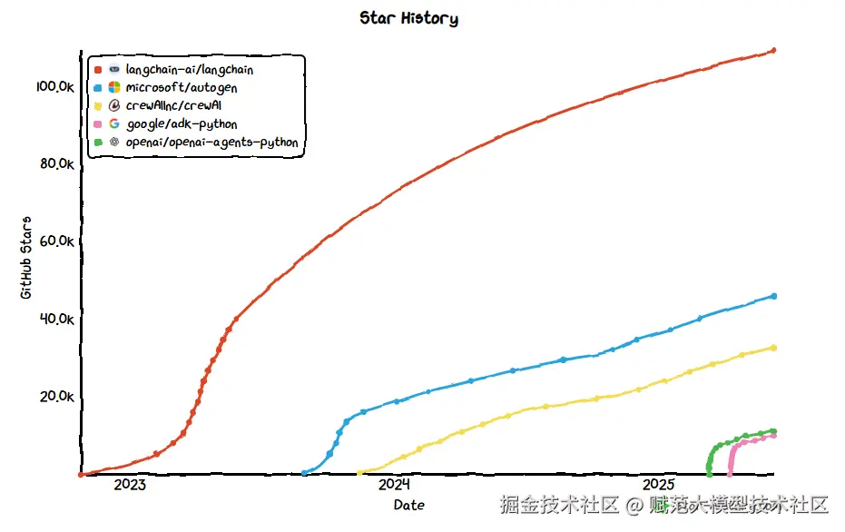 对外,LangChain 也是目前大模型技术领域所有AI Agent框架中最热门、最通用的,相较于AutoGen、CrewAI、OpenAI Agents SDK和Google ADK,拥有最多的收藏量和活跃的开发者数量。