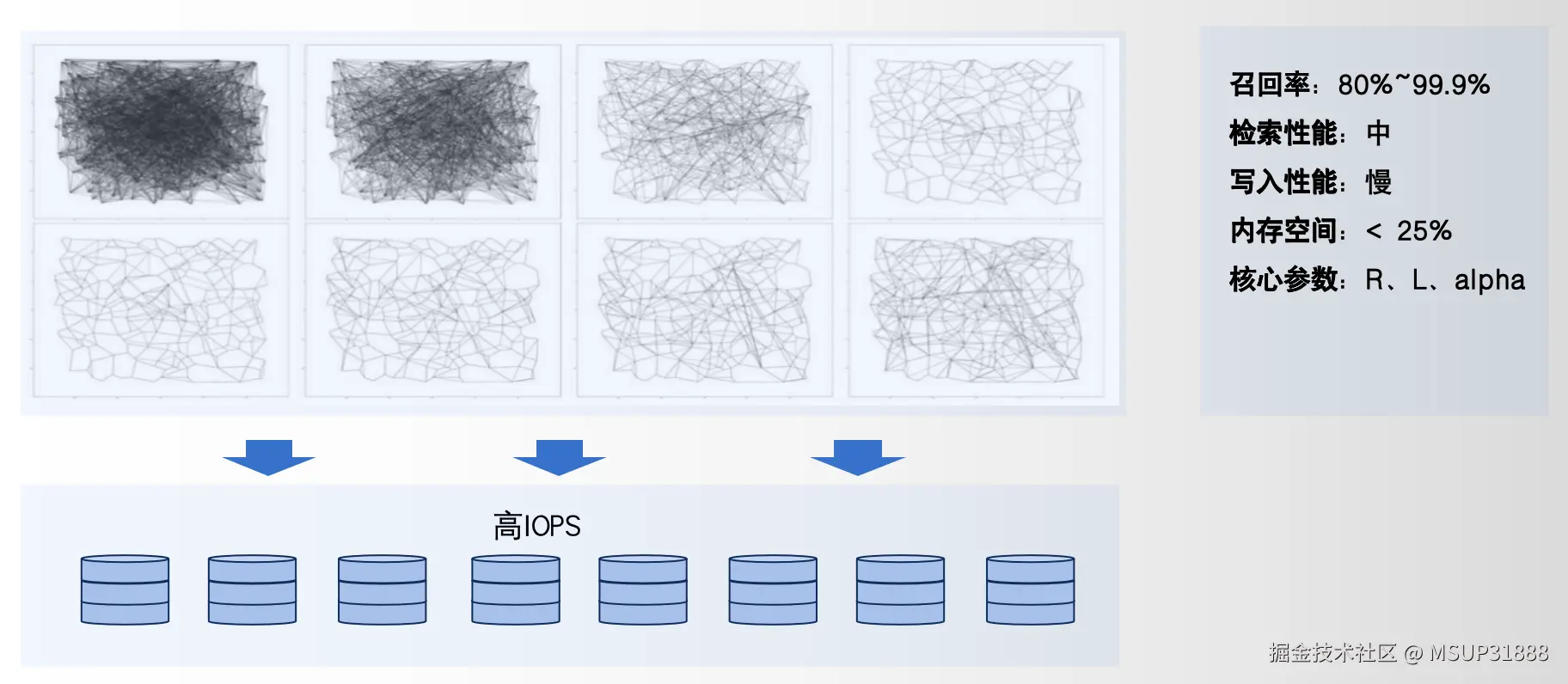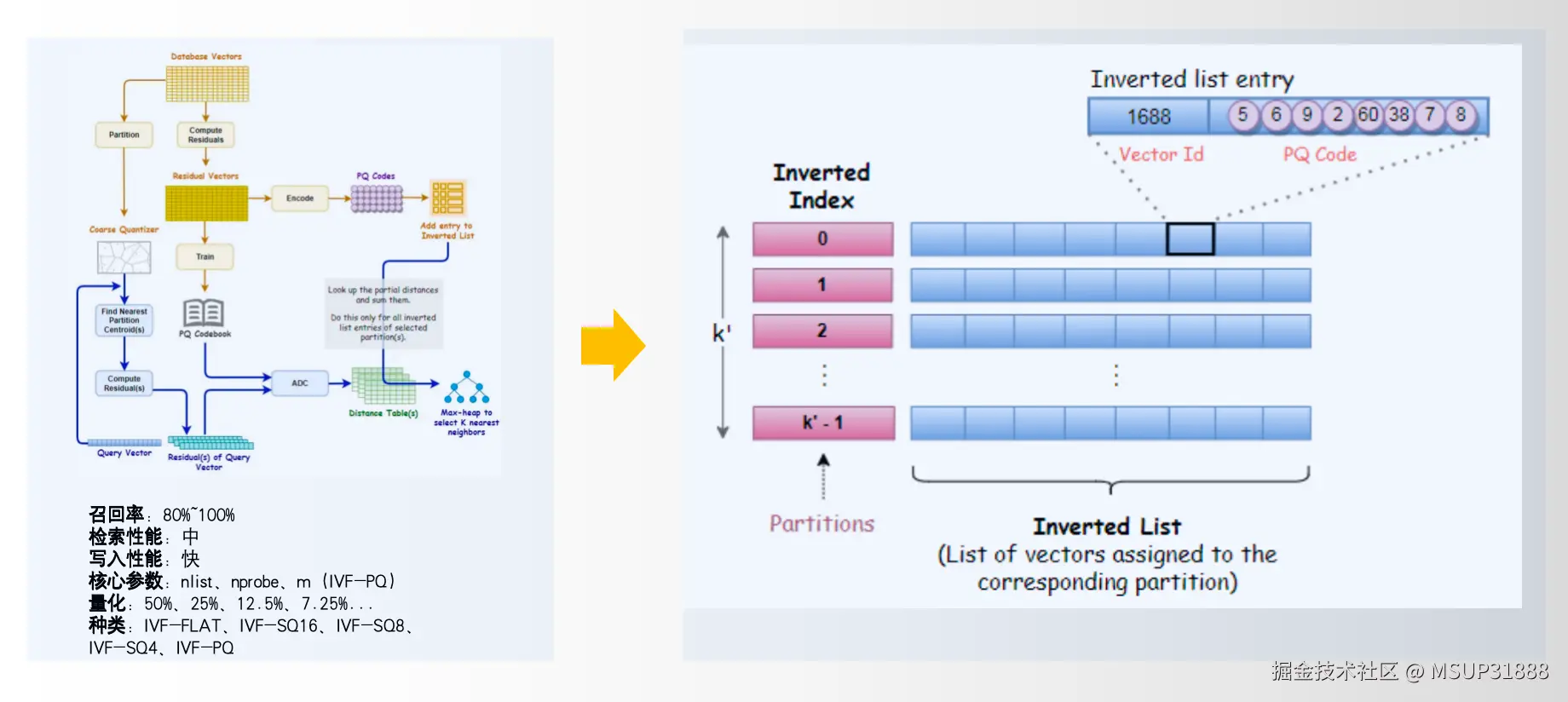 **• IVF系列:**基于聚类,适用于超大规模(亿级+)。写入快,通过量化(PQ等)可降低存储成本50%-75%。召回率80%-100%。