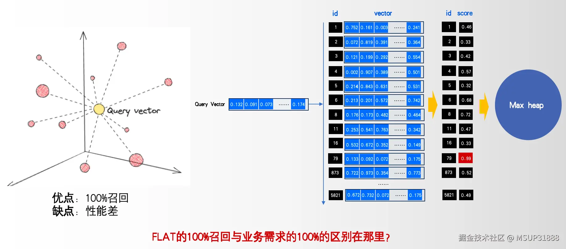 **• FLAT:**暴力检索,100%向量召回率,适用于小规模强召回率场景。但计算开销巨大(需全量比对)