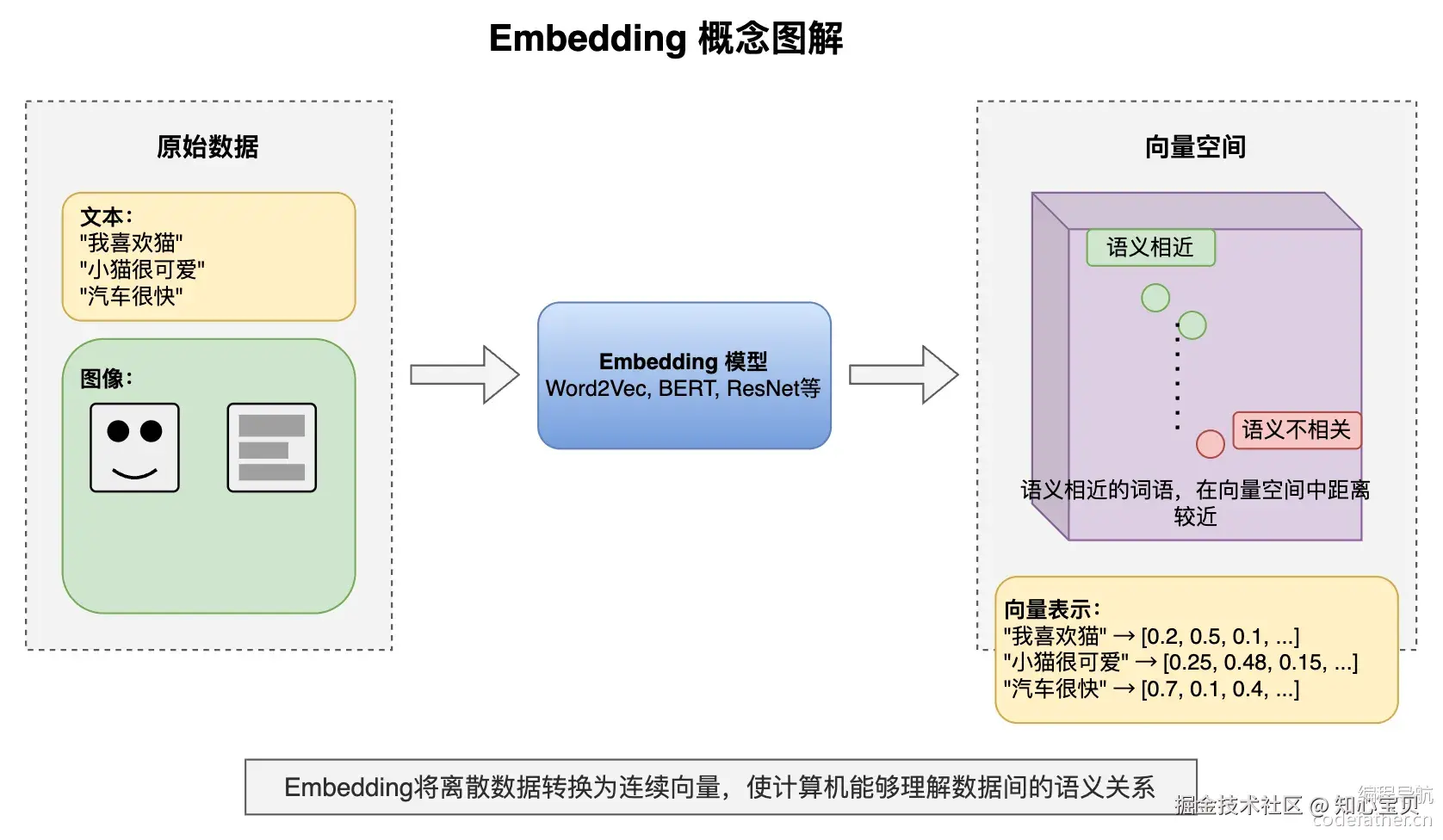 Embedding 嵌入是将高维离散数据(如文字、图片)转换为低维连续向量的过程。这些向量能在数学空间中表示原始数据的语义特征,使计算机能够理解数据间的相似性(语义相关和不相关,命中概率大)