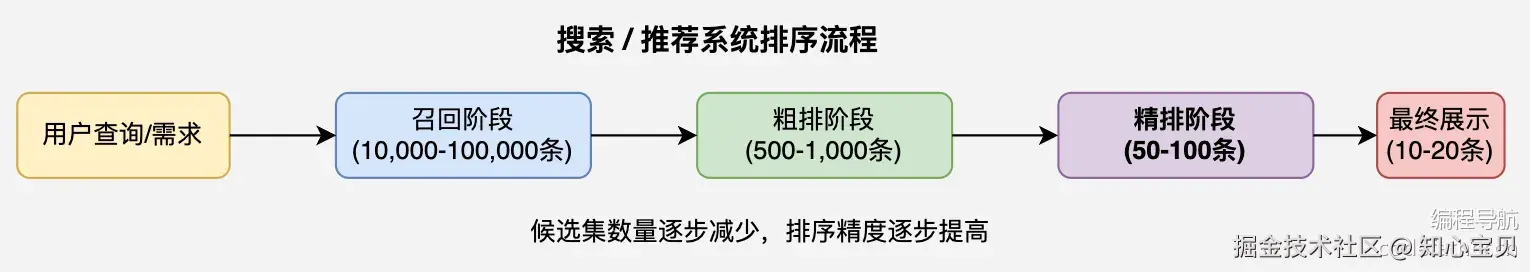 精排(精确排序) 是搜索 / 推荐系统的最后阶段,使用计算复杂度更高的算法,考虑更多特征和业务规则,对少量候选项进行更复杂、精细的排序