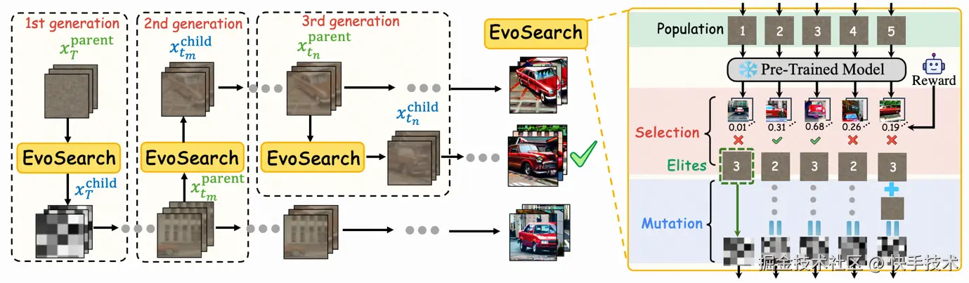 为了回答这一问题,最近香港科技大学联合快手可灵团队推出Evolutionary Search (EvoSearch)方法,通过提高推理时的计算量来大幅提升模型的生成质量,支持图像和视频生成,支持目前最先进的diffusion-based 和 flow-based模型。