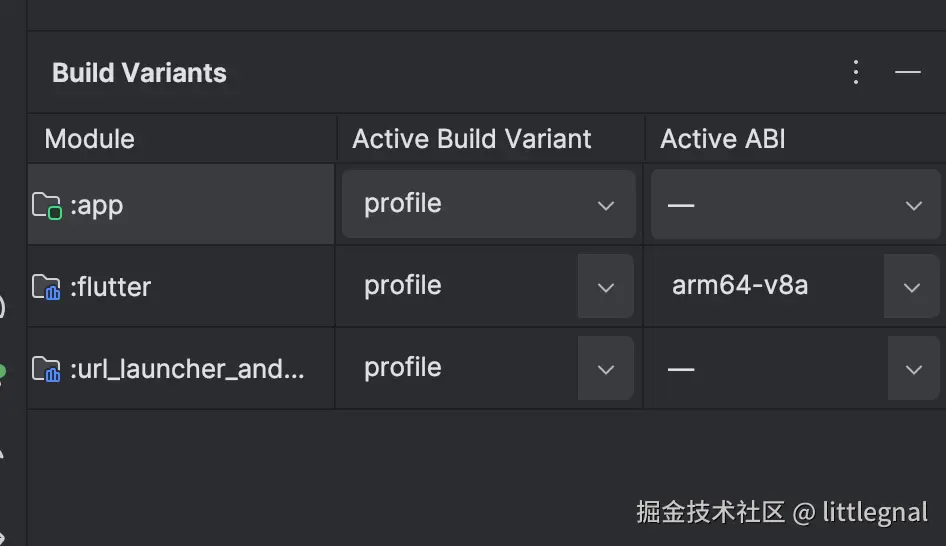 通过Android Studio菜单Build > Select Build Variant打开Build Variants面板,选择profile variant。