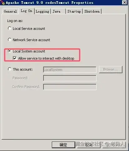 进入安装目录下 apache-tomcat-9.0.85\bin 下运行 codesTomcatw.exe,切换到 Log On 把缺省的设置改为下图所示,也就是勾选第三项及其 check box