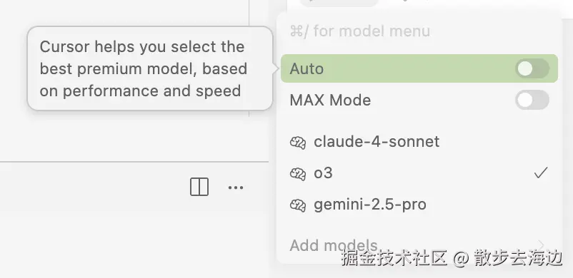 不要启用这个 Auto 选项,因为你不知道 Cursor 背后到底给你用的什么模型,有可能是很旧的模型也有可能是免费模型,所以不要启用,每次都手动指定模型!要把每一分订阅费都花出去。