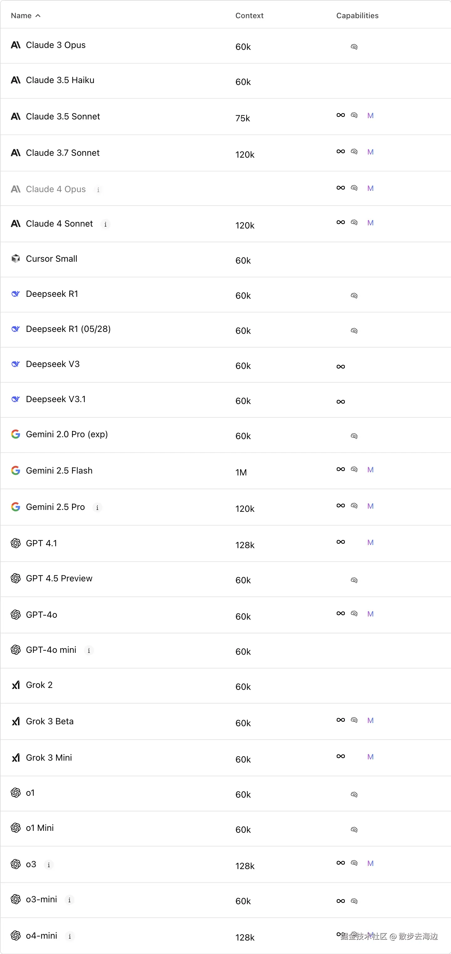 下面是 Cursor 中内置的 Model 的 Context 长度。你会发现与各个模型官网提供的长度不一致,这是因为 Cursor 内部还有一些系统提示词、其他提示词工程的优化、Model 性能权衡作出的妥协,这些要占用一些空间