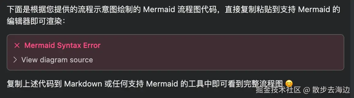 但是经常会遇到渲染错误,这是因为 Cursor 内置的 mermaid 渲染器版本很旧(8.x),但是 AI 往往会使用 10.x 的语法来编写绘图指令