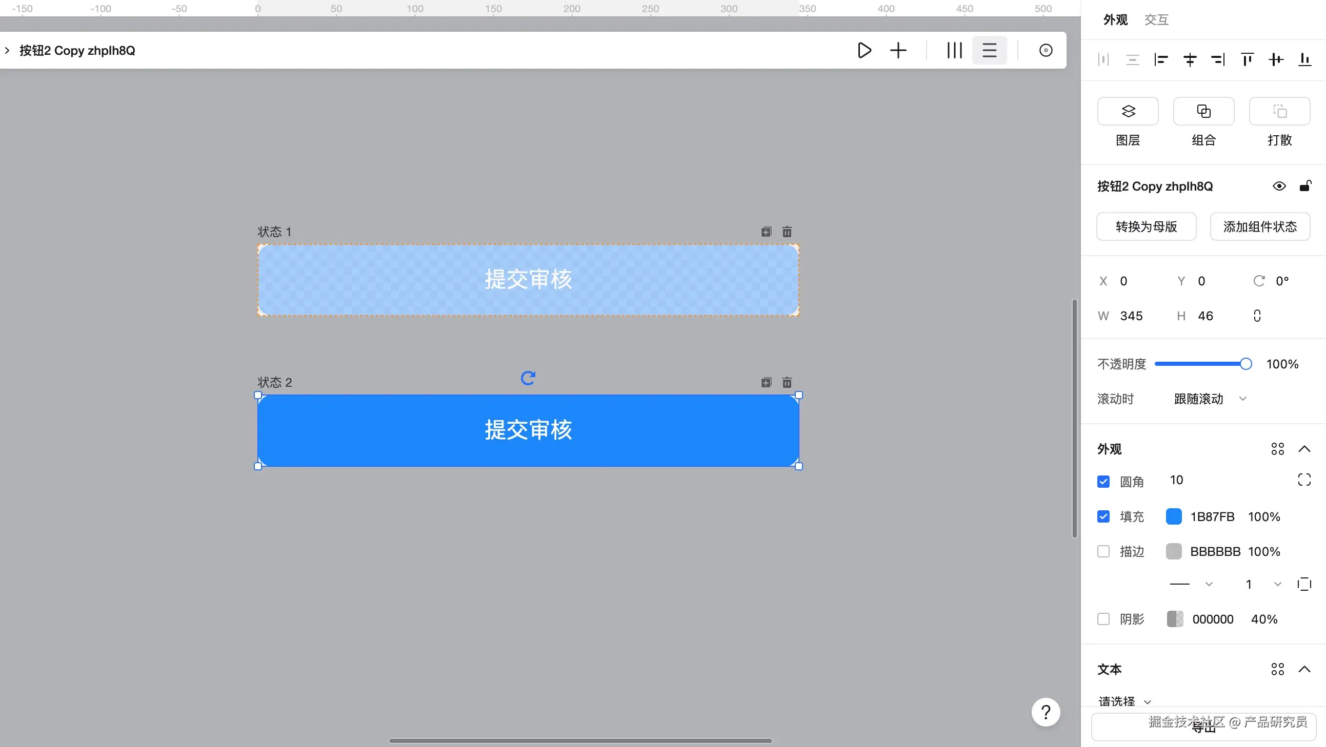 为了让“提交审核”按钮在不同状态下有明显视觉区分,我们需要先将其设置为一个动态组件,包含两个状态:状态1——按钮为灰色,不可点击;状态2——按钮为高亮色,可点击。具体设置步骤如下: