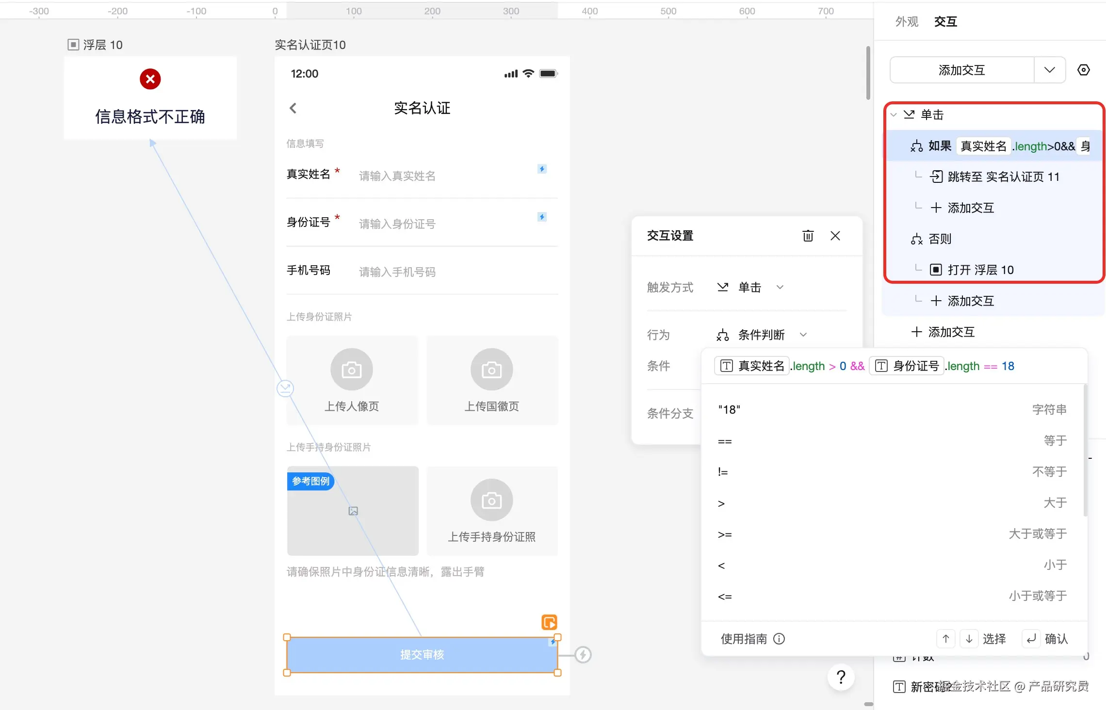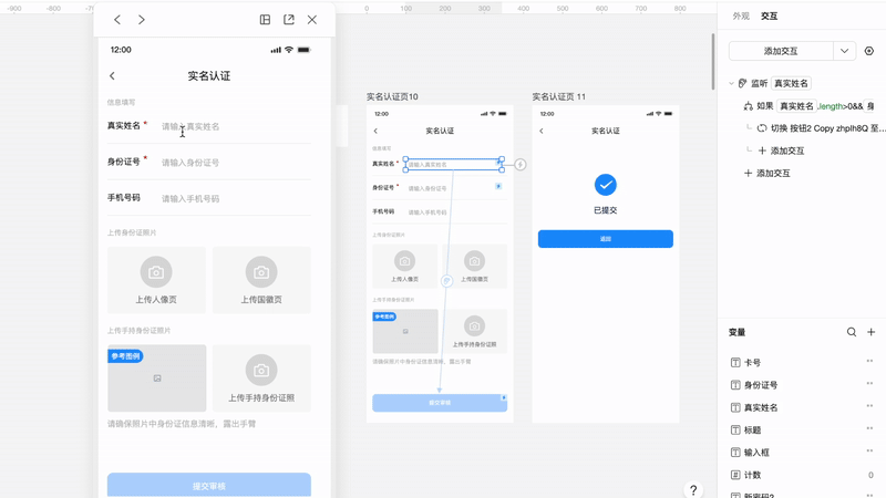 在高保真原型设计中,除了简单页面跳转或者动效,还会利用一些高阶的交互功能来模拟用户真实操作反馈。本文结合一个高保真APP原型的动态交互案例——“实名认证”信息填写页,拆解其背后的高级交互逻辑,教你如何运用变量、监听、条件判断以及函数运算等高级交互功能。