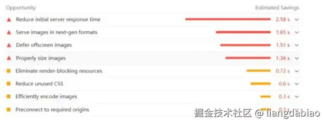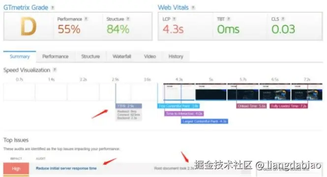 观察问题 :首先要解决瓶颈问题。现在发现问题是 ”Reduce initial server response time“ — 减少初始服务器响应时间。