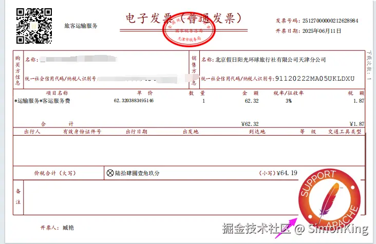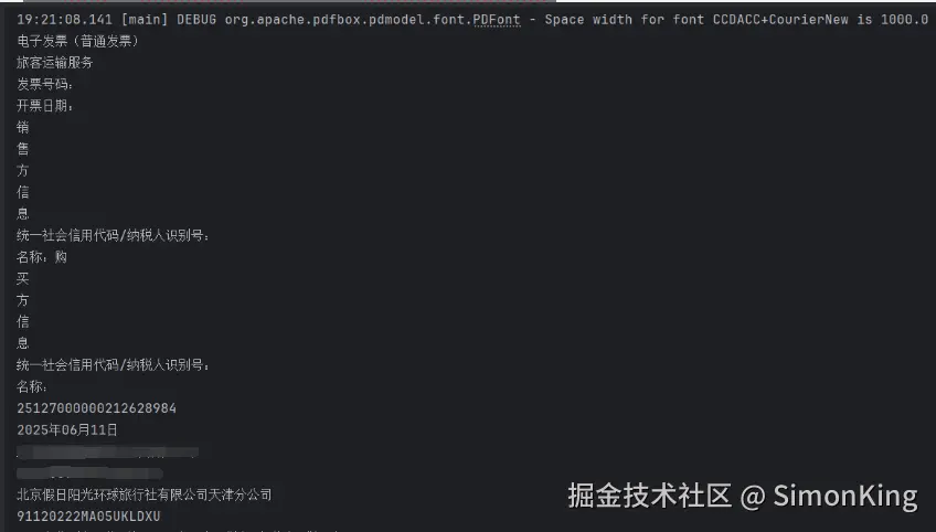 因为PDDocument使用完毕之后需要关闭资源,类似JDK中的流。这里使用try-with-resources自动关闭资源。案例提取了一张网约车发票的信息。