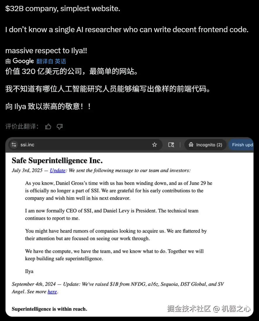人们只能不断猜测 Ilya 在做些什么,SSI 极简风格的网站也被人们津津乐道: