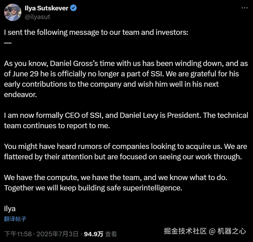 正如你们所知,Daniel Gross 在我们公司的时间已接近尾声,自 6 月 29 日起,他已正式退出 Safe Superintelligence(SSI)。感谢他对公司早期的贡献,并祝愿他在未来的工作中一切顺利。