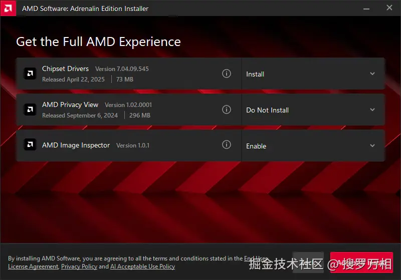 安装位置 - 用于更改默认安装位置。注意:建议使用默认位置 (C:\Program Files\AMD) 进行安装。