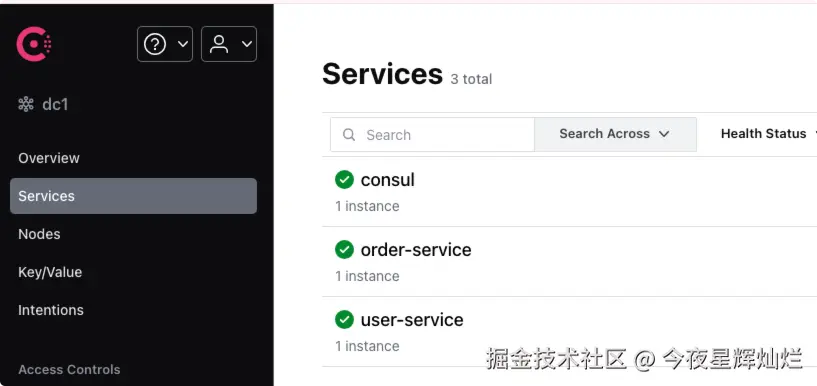 然后先启动 user-service 和 order-service,查看 consul 的服务,这里发现已经注册成功。