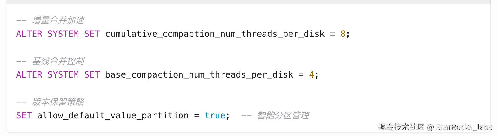 - 参数调优(回收站机制 & 版本合并机制):针对数据生命周期管理及版本存储策略进行多项 BE 参数优化,有效降低了系统负载,确保跑批任务高效、准时完成。