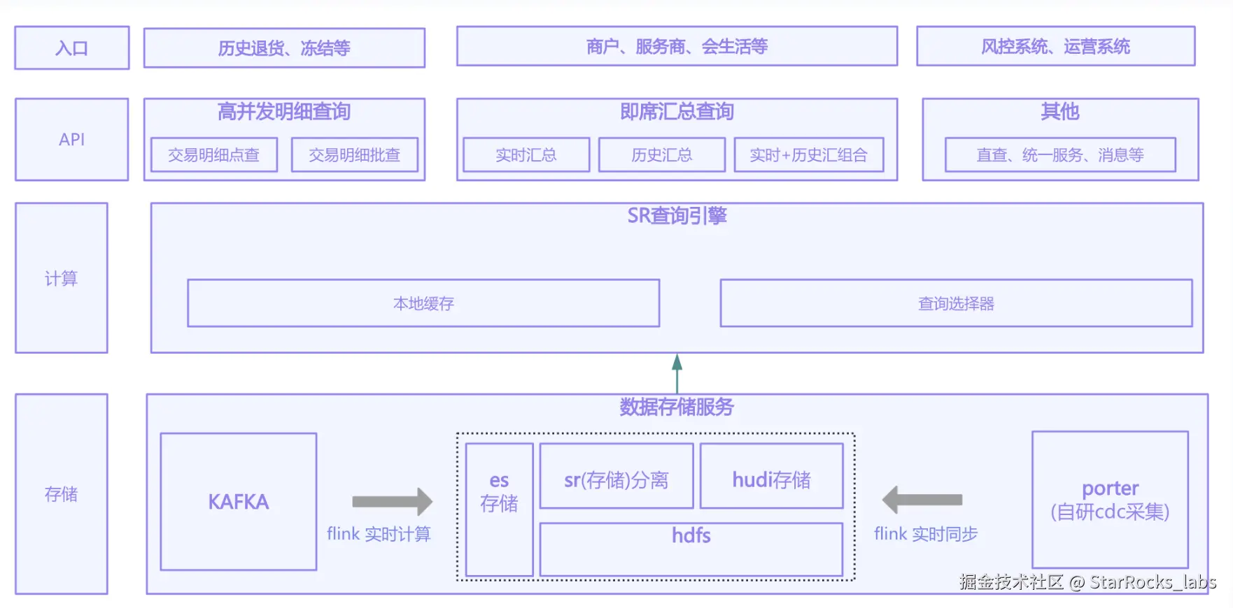 为应对这一挑战,随行付重构了大数据分析体系,构建起以自研Porter CDC + StarRocks + Elasticsearch 为核心的一体化实时架构,全面覆盖高并发明细查询、即席汇总分析和复杂跑批计算等关键场景。