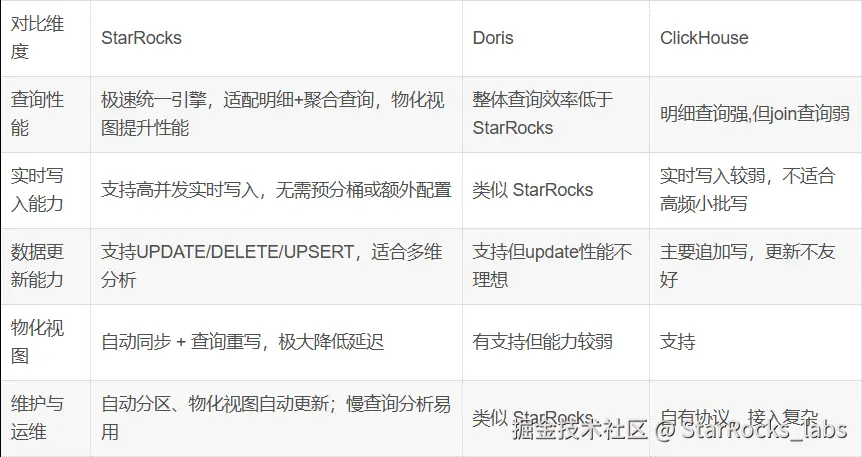 在调研和测试过程中,我们重点对比了 StarRocks 与 Doris、ClickHouse 等主流 OLAP 引擎,StarRocks 在多个方面表现更为突出,具体优势如下: