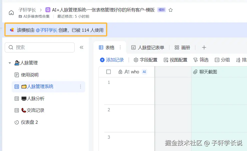 上个月我专门针对人脉管理,设计的一套多维表格,已经110+人下载使用了,我也没想到大家需求还蛮大的,而且反馈也非常不错。