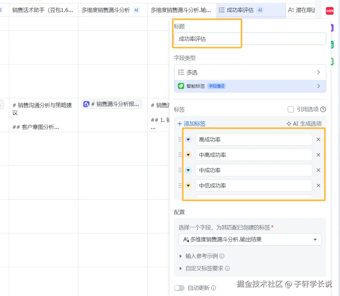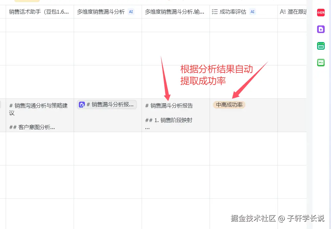不仅如此,除了第一列的销售话术助手,还有第二列的多维度销售漏斗分析,这一列就是根据聊天记录,追踪客户从初次接触到最终成交的全过程数据,识别关键转化节点和流失痛点,提供针对性优化方案,预测销售周期和成功率,辅助资源分配决策,所以我单独提取了一列,对成功率进行了评估,如下截图: