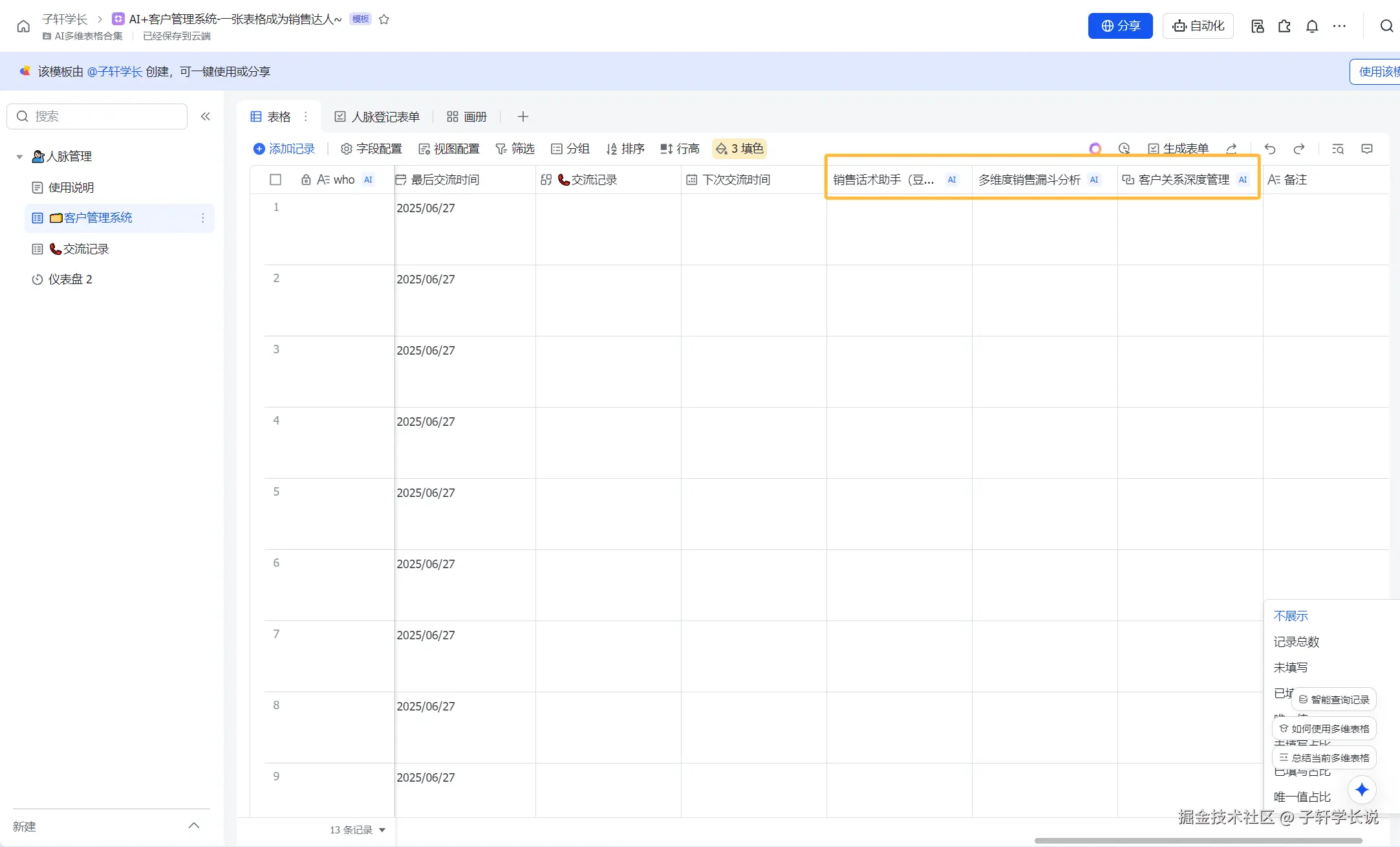 前两天豆包1.6模型升级之后,增加了识图,深度思考,识别视频的能力,于是我在升级了 【人脉管理】 模版之后,又想着单独再制作一个针对客户管理的表格。