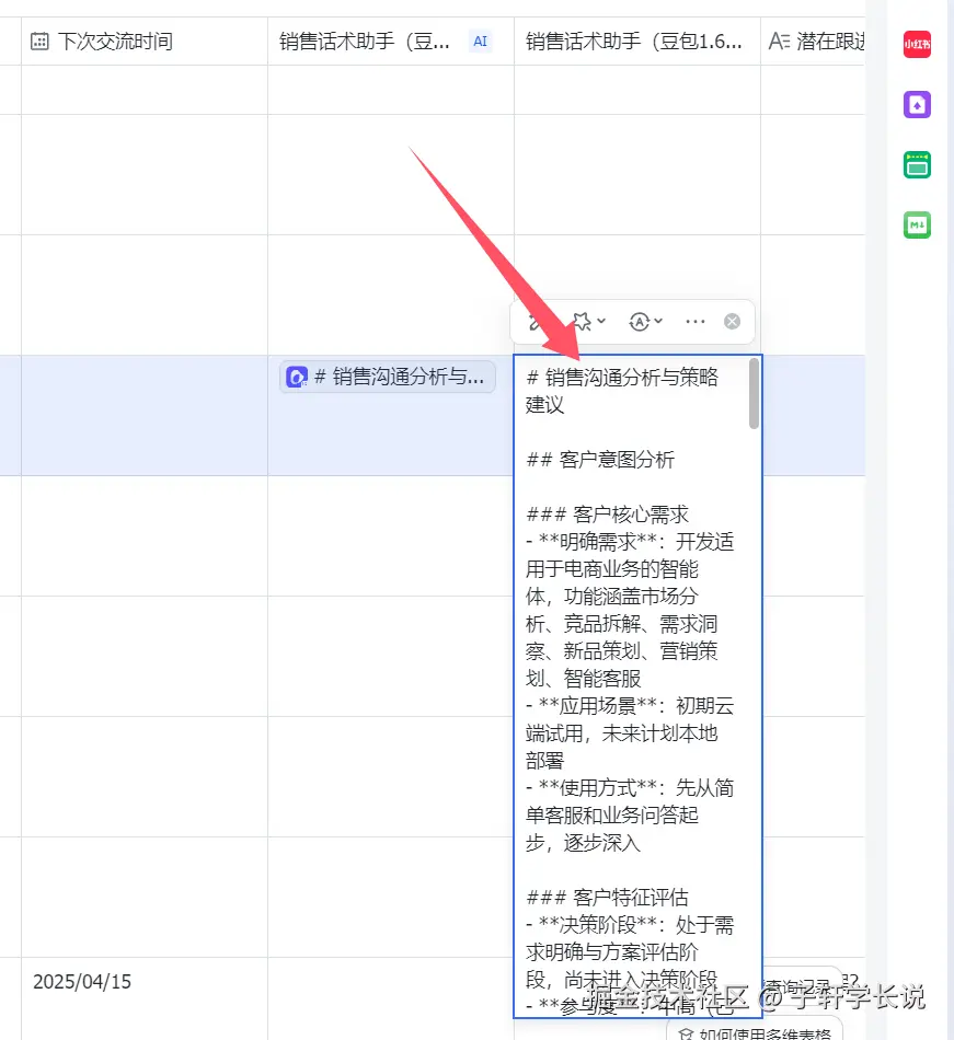 依托豆包1.6强大的识图能力,我测试了下,对于聊天记录当中对话日期,对话详情都能准确识别,这样就不用担心客户信息错误的问题,于是第三列【客户关系深度管理】就更加牛逼了。