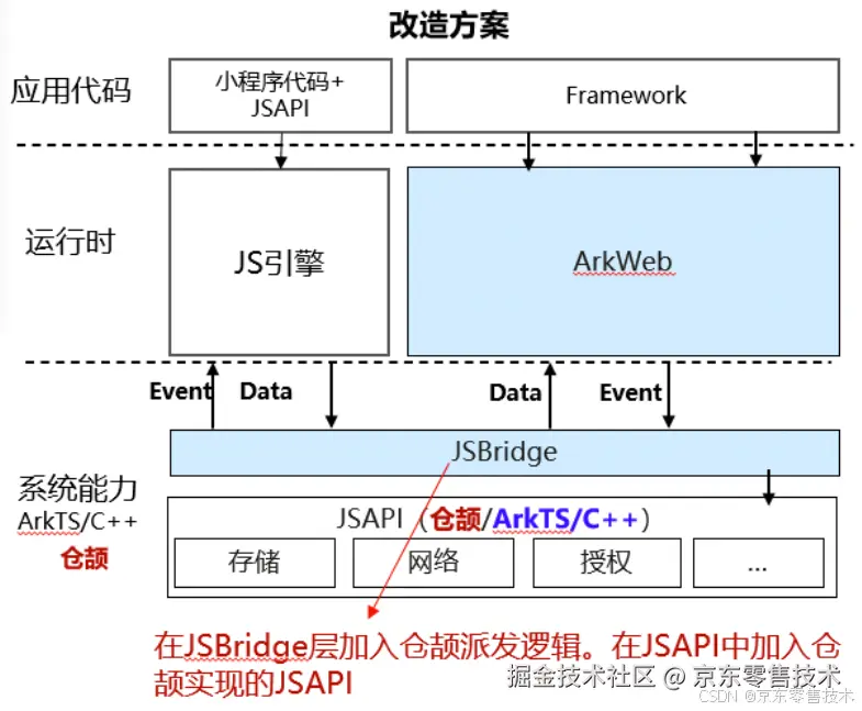 本次改造在小程序架构上重点涉及到两个模块。在JSBridge中加入仓颉API的派发逻辑,和在JS API中加入仓颉实现的JS API(getSystemInfo),如下图