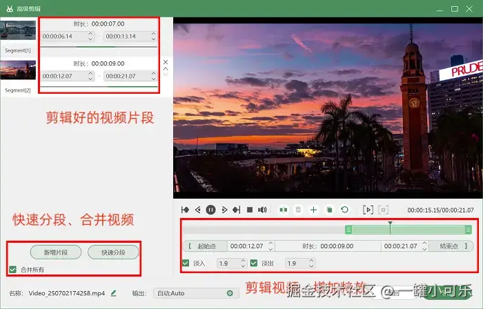 步骤3:结束录制后,我们可以打开 “高级剪辑” 页面对视频进行精确地裁切,还可以添加淡出等转场效果。