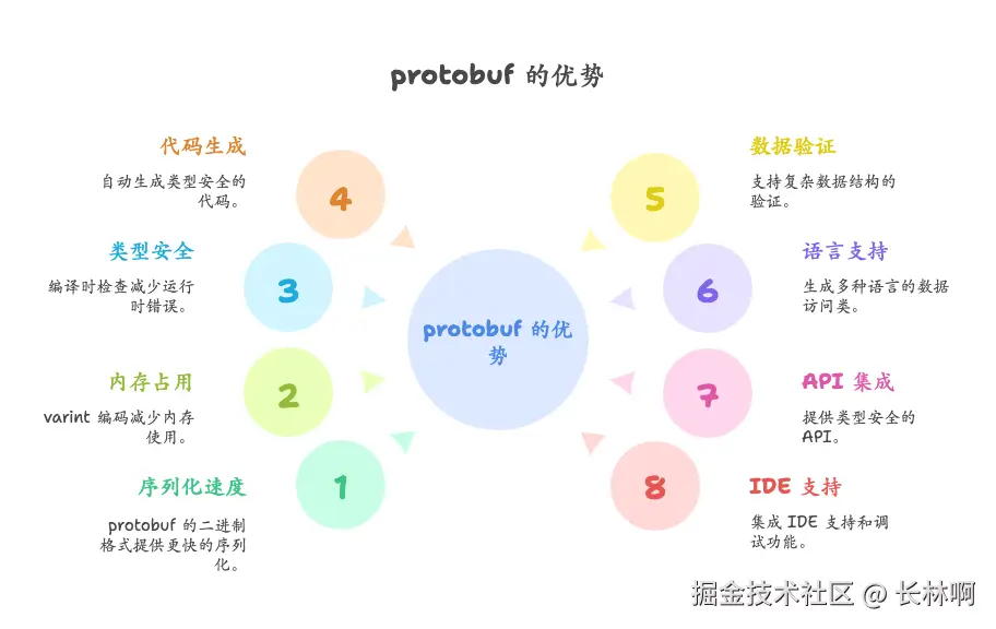 Protocol Buffers(简称 protobuf)是 Google 开发的一种语言中性、平台中性的可扩展序列化结构数据格式,广泛应用于数据存储、通信协议和服务接口定义等场景。相比传统的 JSON 和 XML 格式,protobuf 具有更高的序列化性能、更小的数据体积和更强的类型安全性,已成为现代微服务架构中不可或缺的技术组件。