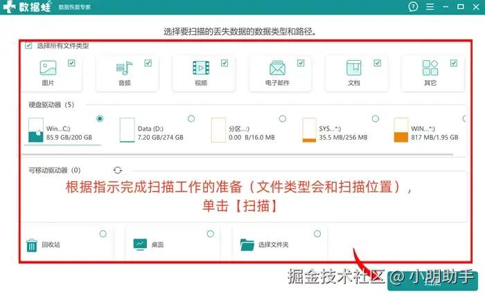 步骤1: 安装好相应版本后,在电脑中开启数据 蛙恢复专家。进入到软件的首页后,我们可以考虑自己的实际需求,选择文件类型和扫描位置,按下【扫描】;
