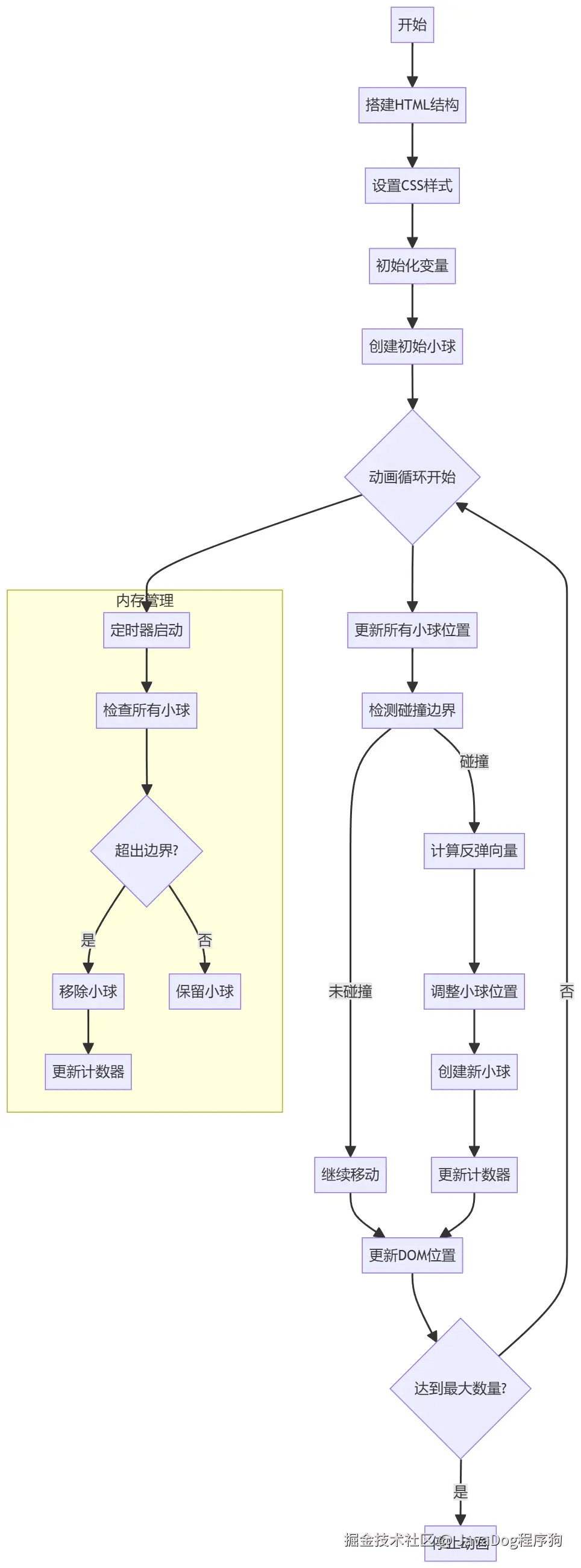 从HTML结构搭建开始,创建了一个圆形容器和计数器;然后通过CSS设置基本样式,包括圆形边界和小球样式;JavaScript部分实现了小球创建、碰撞检测、反弹逻辑和无限分裂效果,并添加了内存管理机制防止性能问题。