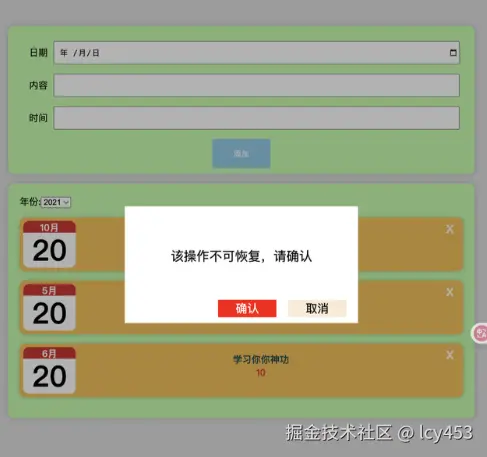 当然我们删除时候是不可逆的,那么就需要一个提示框,在每次删除前强制用户看到这个,让她们判断是否确定删除。