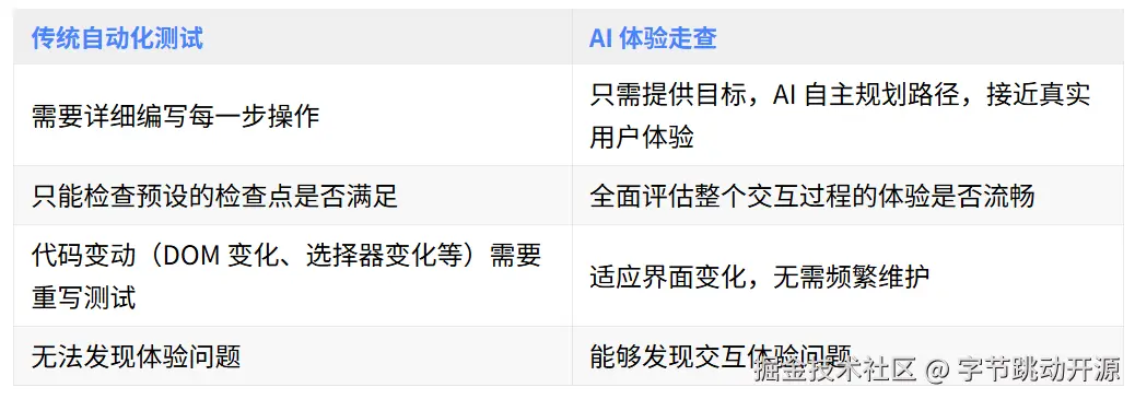 该系统彻底解放了故事走查的人工成本,效果十分显著。与传统自动化测试相比,AI 在用户体验领域具有明显的优势: