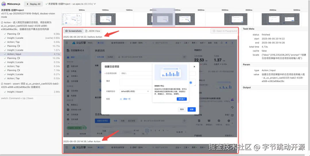 我们从 Midscene.js 的回放报告中可以看到 Midscene.js 在动作的前后进行了记录(Before Action、After Action)
