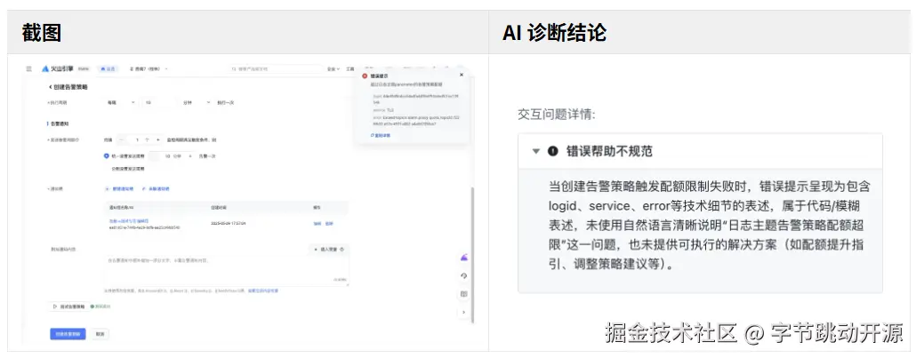 发现问题:创建告警策略中配额不足导致出错时,错误提示不友好,且没有给出相应的解决方案指引