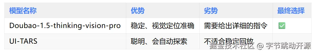 在 AI 模型选用上,经过测评比对,我们采用了 Doubao-1.5-thinking-vision-pro 大模型,它具有优秀的视觉理解和自然语言处理能力,能够准确理解界面元素和操作指令。
