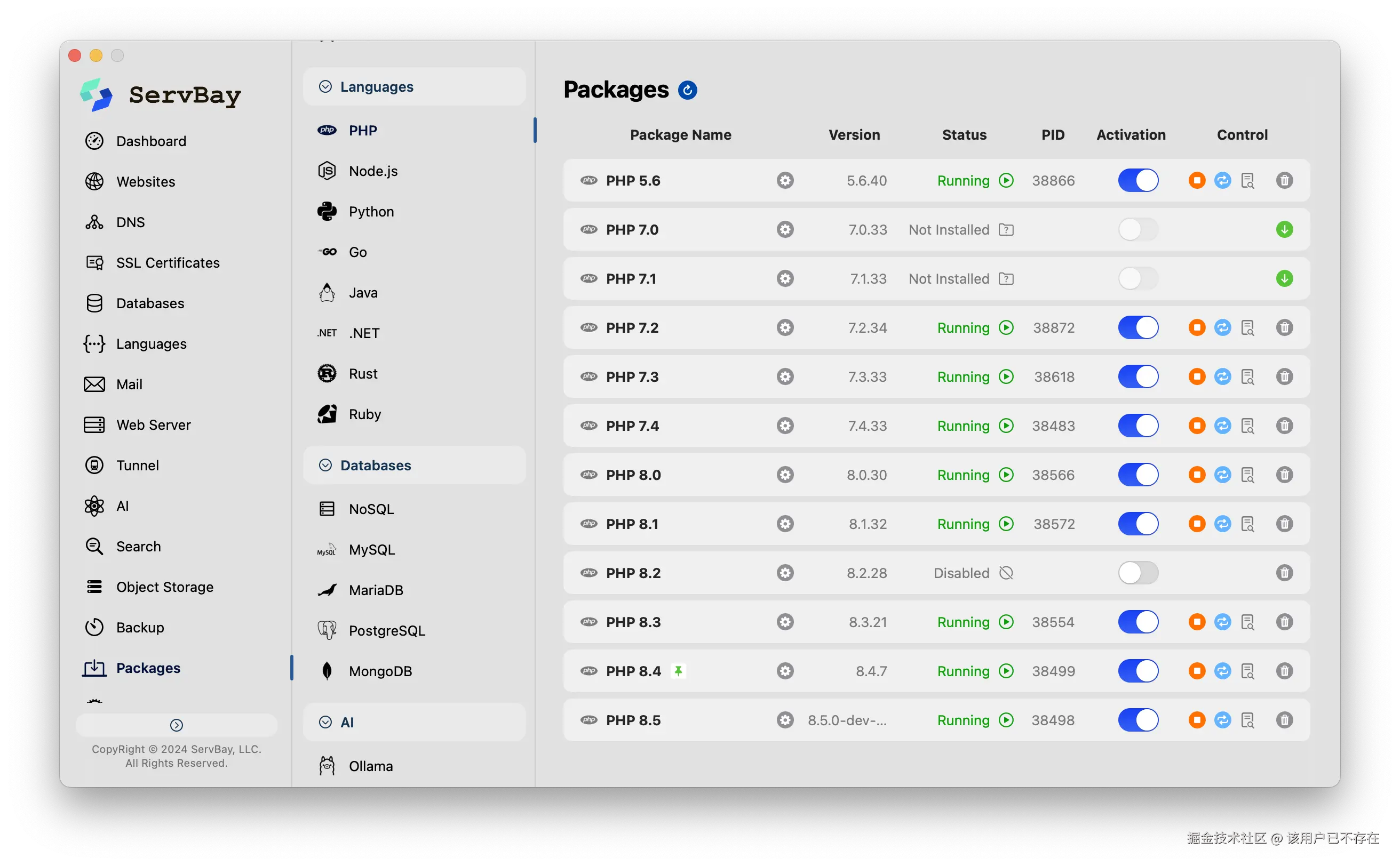启动服务: 打开 ServBay,在左边「软件包」选项中,安装并启动需要的软件。