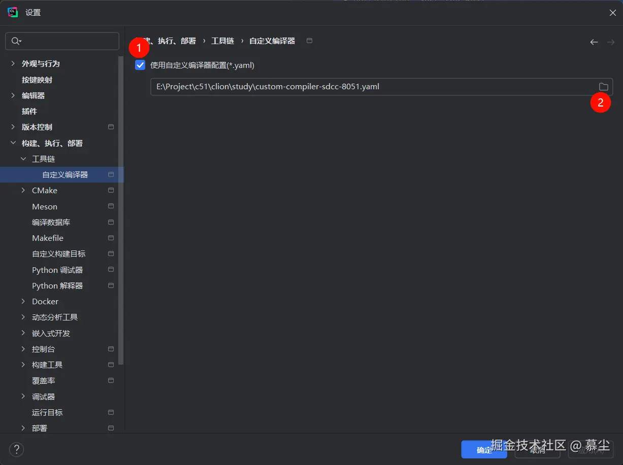 然后在设置中找到构建、执行、部署 -> 工具链 -> 自定义编译器。
