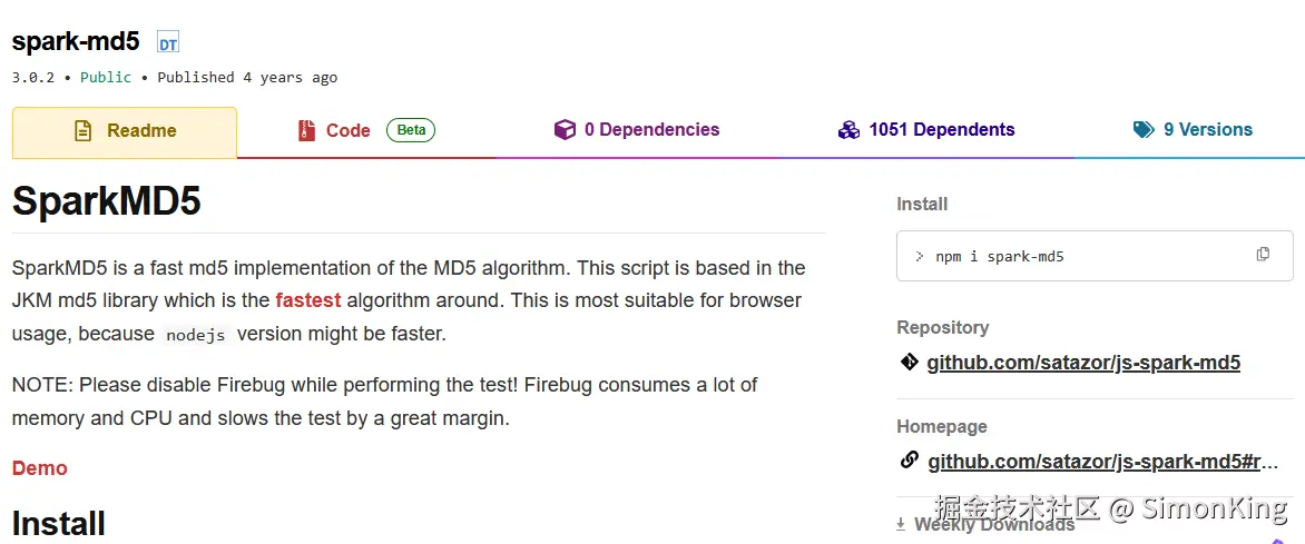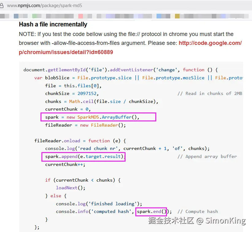 本文使用spark-md5.js的脚本实现:https://cdnjs.cloudflare.com/ajax/libs/spark-md5/3.0.2/spark-md5.min.js。