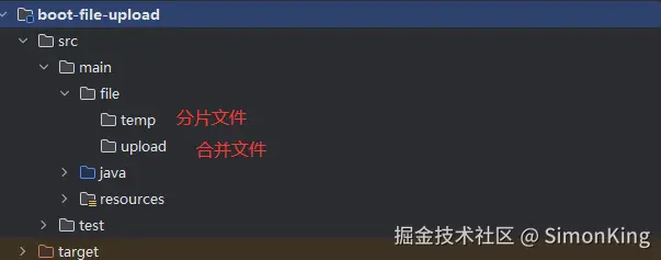 服务的需要考虑将分片数据保存,上传完成后合并分片数据,并删除临时分片。案例将分片数据和合并的数据存放在项目路径下。