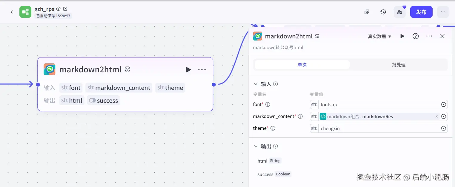 markdown2html(插件): 基于markdown组合(代码) 节点得到了已经插入了配图的Markdown格式文章,只需要基于这个插件将其转换为html格式内容就行,用于后续写入公众号草稿箱做准备。