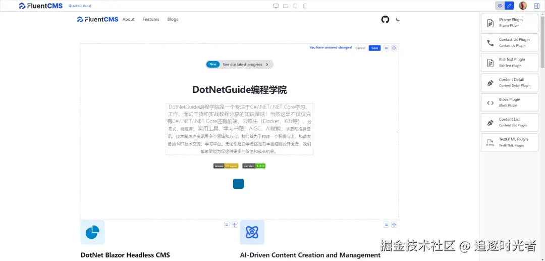 - 项目简介: FluentCMS 是一个开源(MIT license)、现代化的内容管理系统(CMS),它基于强大的 ASP.NET Core + Blazor技术构建。FluentCMS助力内容写作者更高效地创作内容。其设计快速、灵活且用户友好,不仅具备传统基于内容的CMS功能,还擅长作为无头CMS(headless CMS),使其非常适合各种数字应用场景。